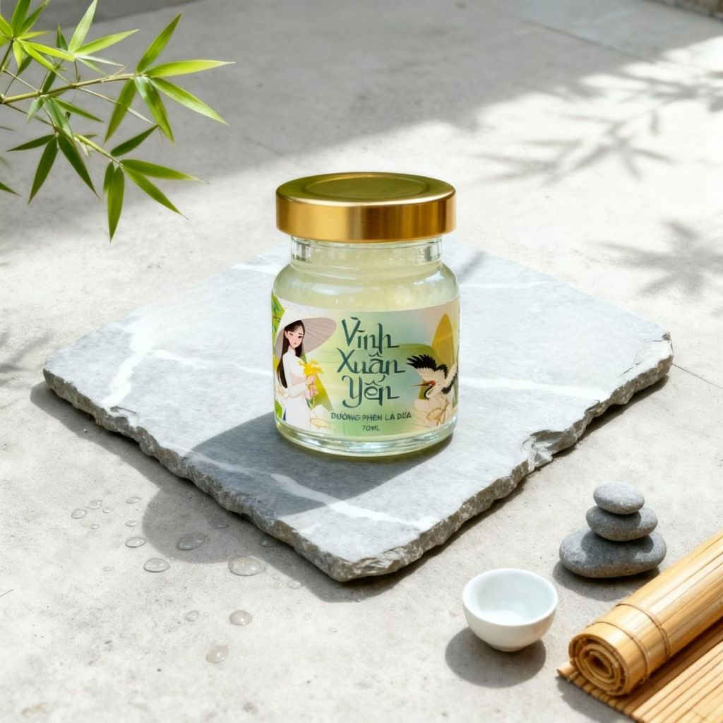Vĩnh Xuân Yến là dòng sản phẩm yến chưng tươi cao cấp, nổi bật với 10 gram yến tươi nguyên chất trong mỗi hũ 70ml. Sản phẩm được chưng cùng đường phèn lá dứa với vị ngọt thanh, thơm mát, giúp thanh nhiệt, giải độc và dịu nhẹ.